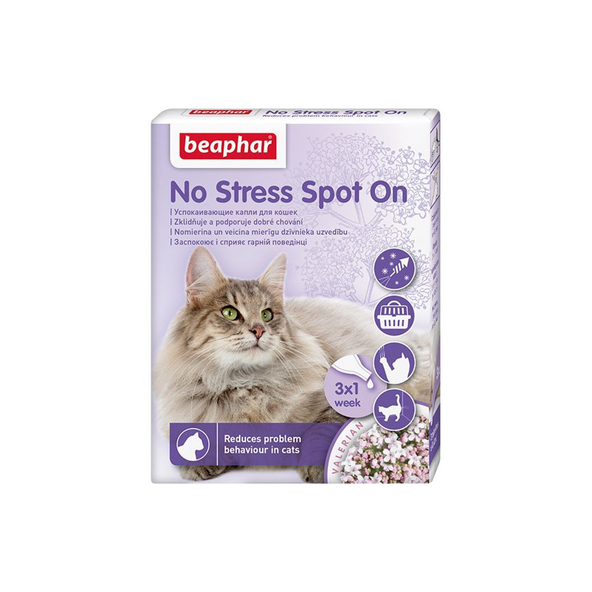 Beaphar No Stress Spot On - rahustavad tilgad palderjaniga. Neil on stressivastane toime kassidele, kellel on närvisüsteemi ärevus või paanikahood. Ravim toimib aeglase vabanemise ja pikaajalise efektiivsuse põhimõttel.Kasutamine: ülemäärane ärevus seoses ümbruse muutumisega, loomaarsti külaskäigu, reisi, äikesetormide või ilutulestike ja muude stressirohkete olukordadega. Sobib kõikidele tõugudele ja vanusele.Mõju ühest rakendusest - 1 nädal.