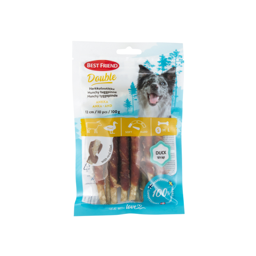 Best Friend Double pulgad keeratud pardifileesse. Närimistoodete regulaarne kasutamine aitab hoida hammaste ja igemete tervist ning vältida halba hingeõhku. Närimistooted pakuvad ka suurepärast meelelahutust koerale stimuleerides samal ajal loomulikku närimisinstinkti. Sobib väiksematele koertele, vanadele koertele ja kutsikatele. Sobib suurepäraselt ka suurematele koertele preemiaks või maiuspalaks. Täiendsööt koertele.
