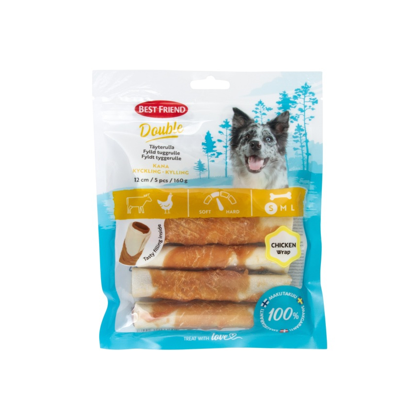 Best Friend Double täidisega rullid kanatäidise ja -fileega. Kahekordse täidisega rullid kanatäidise ja -fileega on kergesti seeditavad, samuti valgurikkad ja madala rasvasisaldusega. Närimistooted aitavad säilitada hammaste ja igemete tervist ning vältida halba hingeõhku. Närimistooted pakuvad ka suurepärast meelelahutust ja turgutavad tõhusalt teie koera igavatel hetkedel, stimuleerides samal ajal loomulikku närimisinstinkti.