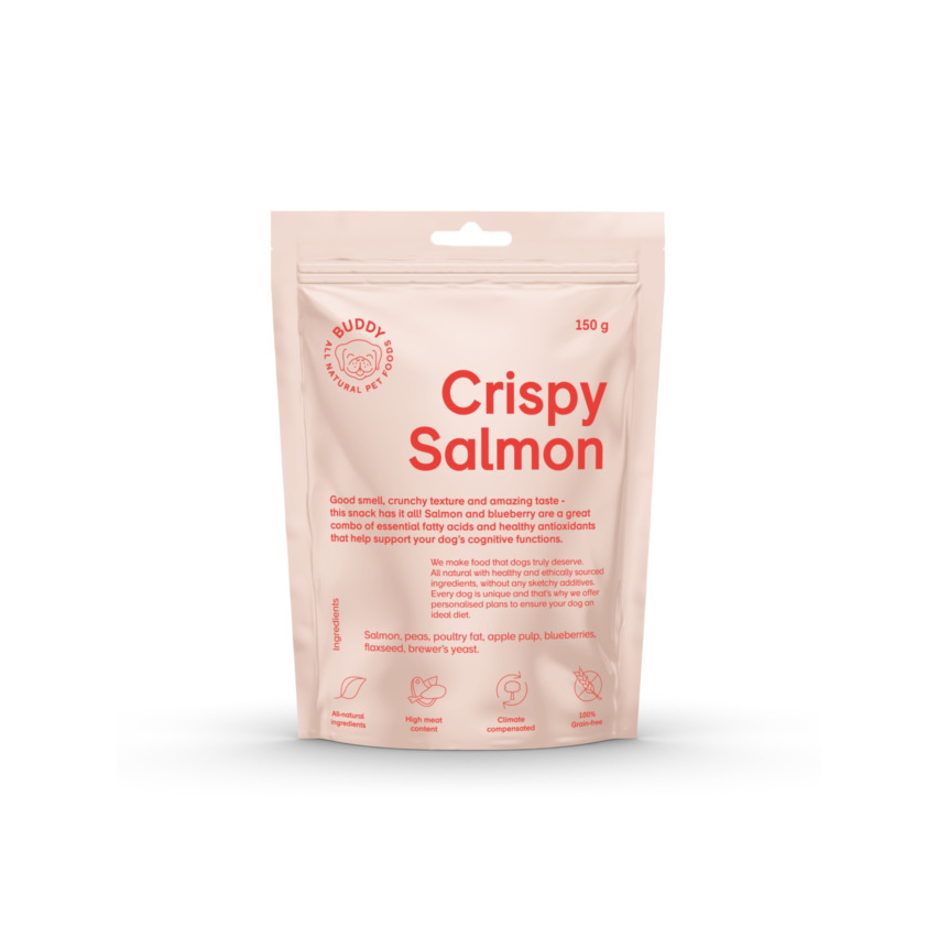 Buddy krõbedad maiused koertele värskest lõhest ja mustikatest, rikkad oomega-rasvade, valgu ja antioksüdantide poolest. Täiendsööt koertele. Koostisosad on 100% looduslikud ning lisaainete ja teraviljavabad. Suurepärased igapäevaseks ja treeningmaiuseks. Koostis: dehüdreeritud lõhe 35%, herned 31%, hüdrolüüsitud lõhevalk 15%, linnuliharasv 6%, kuivatatud õunapüree 5%, kuivatatud mustikad 4%, linaseemned 2%, õllepärm 2%. Analüütilised koostisosad: toorvalk 30%, rasvasisaldus 9%, niiskus 10%, toortuhk 6,5%, toorkiud 3%, kaltsium 1%, fosfor 0,8%, naatrium 0,3%. Sisaldab EL-is heakskiidetud looduslikke antioksüdante: tokoferooli ekstraktid taimeõlist (1b306), askorbüülpalmitaat (1b304) ja rosmariini ekstrakt. Metaboliseeritav energia: 3500 kcal/kg. Söötmisjuhend: See toode ei asenda täisväärtuslikku toitumist. Veenduge, et teie koeral oleks alati värske vesi saadaval. Parim enne kuupäev ja soovitatav söötmistabel: vt pakendilt. Hoida kuivas ja jahedas kohas, vältida otsest päikesevalgust. Pärast avamist sulgeda uuesti.