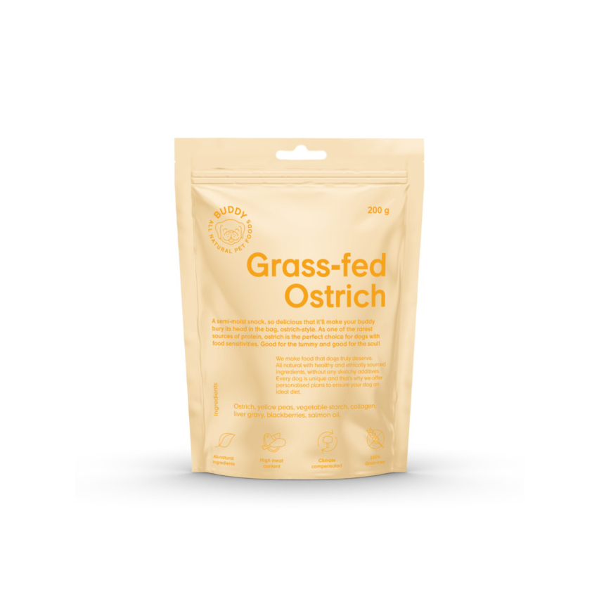 Buddy pehmed maiused koertele värskest jaanalinnust ja murakatest, rikkad valgu ja oomega-rasvhapete poolest. Täiendsööt koertele. Koostisosad on 100% looduslikud ning lisaainete ja teraviljavabad. Ideaalne preemiaks treeningu ajal. Koostis: dehüdreeritud jaanalinn 30%, kollased herned 30%, vedel taimne tärklis 20%, hüdrolüüsitud linnulihavalk 8%, kollageen 5%, linnumaksakaste 5%, kuivatatud murakad 1%, lõheõli 1%. Analüütilised koostisosad: toorvalk 30%, rasvasisaldus 5%, niiskus 17%, toortuhk 6%, toorkiud 1,5%, kaltsium 0,7%, fosfor 0,5%, naatrium 0,3%. Looduslike säilitusainetega: sidrunhape (E 330), DL-õunhape (E 296). Metaboliseeruv energia: 3160 kcal/kg. See toode ei asenda täisväärtuslikku toitu. Veenduge, et teie koeral oleks alati värske vesi saadaval. Parim enne kuupäev ja soovitatav söötmistabel: vt pakendilt. Hoida kuivas ja jahedas kohas, vältida otsest päikesevalgust. Pärast avamist sulgege uuesti.