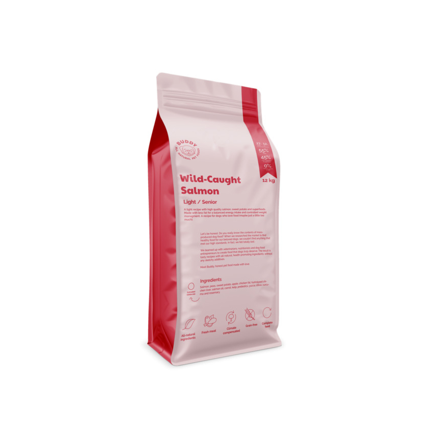 Buddy kuivtoit koertele metsikult püütud lõhega. Täissööt madala aktiivsusega koertele, nagu vanemad ja vähem aktiivsed koerad.