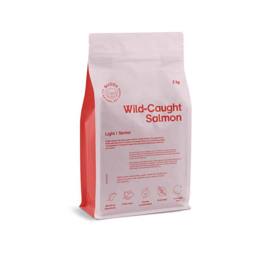 Buddy kuivtoit koertele metsikult püütud lõhega. Täissööt madala aktiivsusega koertele, nagu vanemad ja vähem aktiivsed koerad.