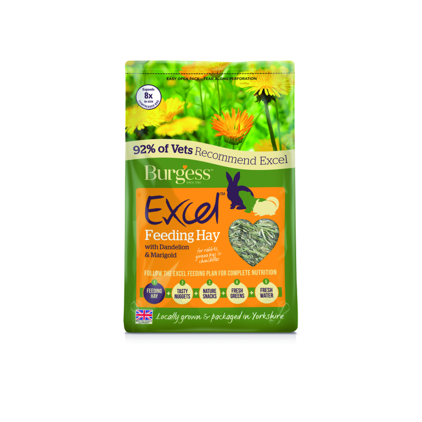 Burgess Excel söödahein küülikutele, merisigadele ja tšintšiljadele võilille ja saialillega. Timutihein on suurepärane kvaliteetse kiudaine allikas. Võilill mõjub soodsalt urinaartrakti tervisele ja saialill toetab immuunsüsteemi.