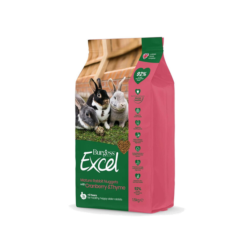 Excel granuleeritud sööt on kiudaineterikas (seeduv kiud 38%) ja aitab ennetada selektiivset toitumiskäitumist. Burgess Mature graanulid sisaldavad seedesüsteemile vajalikke naturaalseid prebiootikume, ning mineraale silmade, naha ja karvastiku tervise heaks. Sisaldab immuunsüsteemi toetavaid naturaalseid antioksüdante. Lisaväärtust graanulitele annavad glükoosamiin liigeste tervise heaks, ženšenn vitaalsuse tõstmiseks ja jõhvikad, mis on suurepäraseks antioksüdantide allikaks.