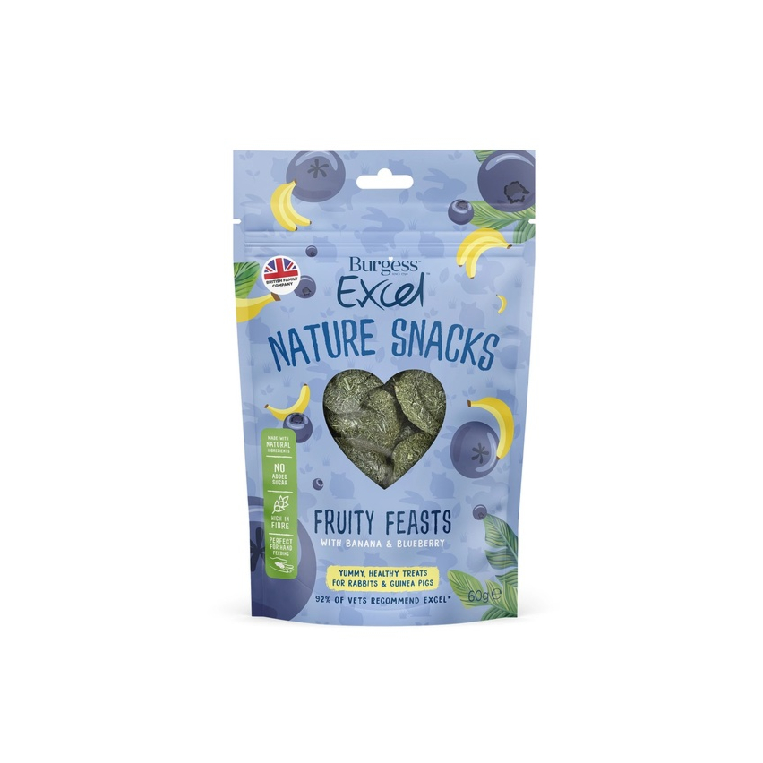 Burgess Excel väikelooma maius Fruity Feasts banaani ja mustikatega. Täiendsööt küülikutele ja merisigadele. Küpsetatud maitsvad maiused, millele ei ole lisatud suhkruid, kunstlikke värv- ega maitseaineid. Fruity Feasts snäkid on kõrge kiudainesisaldusega ja valmistatud looduslikest koostisainetest.