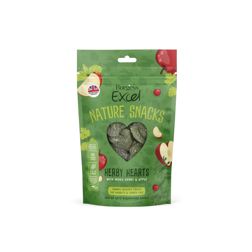 Burgess Excel väikelooma maius Herby Hearts ürtide ja õunaga 60g. Täiendsööt küülikutele ja merisigadele. Küpsetatud maitsvad maiused, millele ei ole lisatud suhkruid, kunstlikke värv- ega maitseaineid. Herby Hearts snäkid on kõrge kiudainesisaldusega ja valmistatud looduslikest koostisainetest.