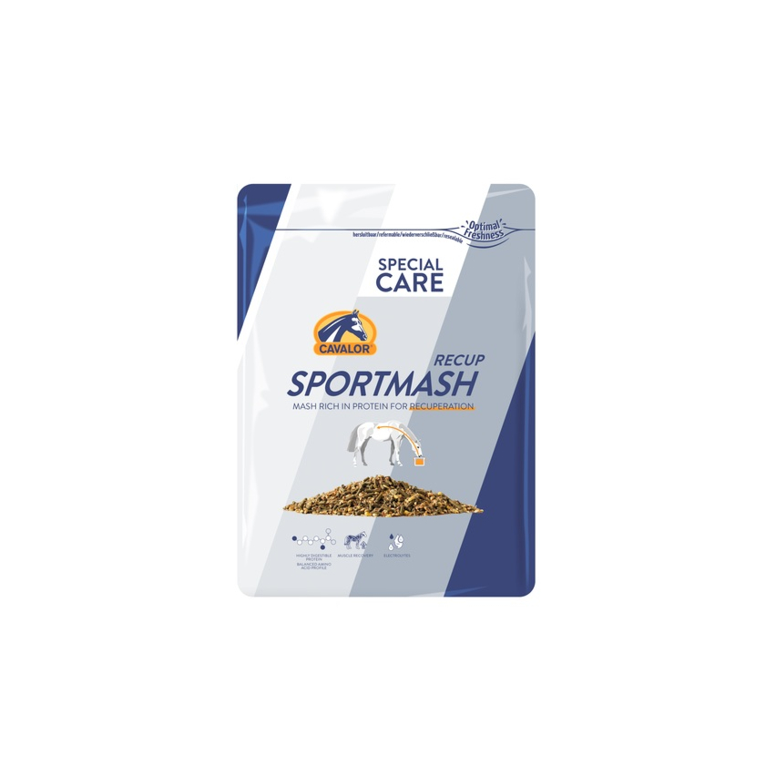 CAVALOR SPORTMASH RECUP - valgurikas puder treeningu järgseks taastumiseks. See on kvaliteetse, kergesti seeduva ja spetsiifilise aminohappeprofiiliga valgu allikas, mis aitab optimaalselt kaasa lihaste taastumisele pärast treeningut või võistlusi. Pudru leotamine tagab lisavedelike imendumise. Elektrolüütide (naatrium, kaalium ja kloriid) higistamisjärgse kaotuse täiendamiseks. Hästi seeduv valk ja tasakaalustatud aminohapete profiil