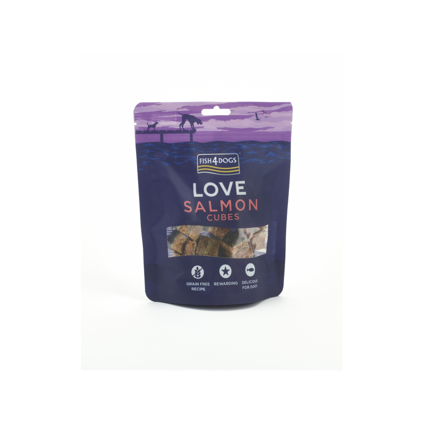 Fish4Dogs koera maiused Love lõhe kuubikud. Täiendsööt koertele. Krõbedad, kuivatataud lõhekuubikud on rikkalikud Omega-3 poolest, mis toetab nahka, karva ja liigeseid. Naturaalne lõhe, mis on kuivatatud on väljast krõbe, seest kergelt niiske ja lummab igat koera oma teksuuri, lõhna ja maitse poolest.