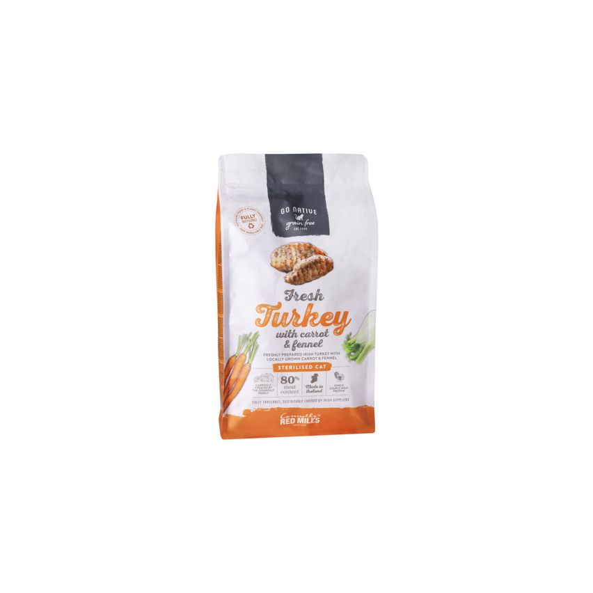 Go Native kassi täissööt kalkuni, porgandi ja apteegitilliga. Täissööt stereliseeritudkassidele alates 9 nädalat. Iirimaal, värskest ja kohalikust toorainest toodetud kuivtoit. Kõik koostisosad on hoolikalt välja valitud ja testitud kohalikus laboris. Sisaldab D3-vitamiini ja kaltsiumi, luude ja liigeste toetamiseks, tsellulooskiudusid, karvapallide ennetamiseks, jõhvikaid ja magneesiumi, mis toetavad kuseteede tööd ja aitavad hoida pH taset madalamana.