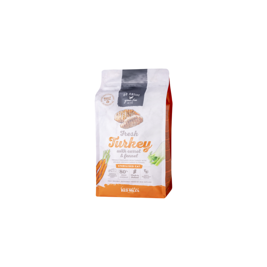 Go Native kassi täissööt kalkuni, porgandi ja apteegitilliga. Täissööt stereliseeritud kassidele alates 9 kuud. Iirimaal värskest ja kohalikust toorainest toodetud kuivtoit. Kõik koostisosad on hoolikalt välja valitud ja testitud kohalikus laboris. Sisaldab D3-vitamiini ja kaltsiumi luude ja liigeste toetamiseks, tsellulooskiudusid karvapallide ennetamiseks, jõhvikaid ja magneesiumi, mis toetavad kuseteede tööd ja aitavad hoida pH taset madalamana.