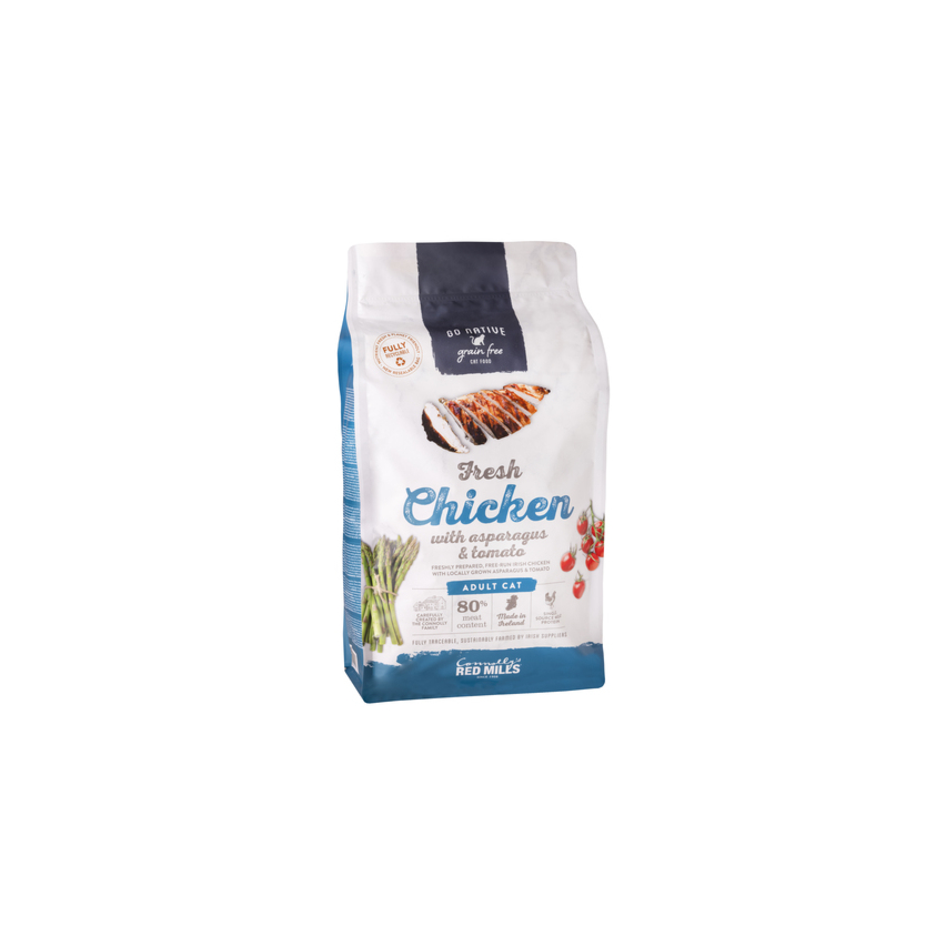 Go Native kassi täissööt kana, spargli ja tomatiga. Täissööt kõikidele kassidele alates 8 nädalat. Iirimaal, värskest ja kohalikust toorainest toodetud kuivtoit. Kõik koostisosad on hoolikalt välja valitud ja testitud kohalikus laboris. Sisaldab tauriini, mis toetab südame tervist ja maksatööd, tselluloos kiudusid, mis ennetavad karvapallide teket, sparglit, mis on hea seedimisele ja Omega rasvhappeid (3 ja 6) ja tsinki, mis on head nahale ja karvale. Koostis, lisandid: vt pakendil. Soovitatud päevane annus: Kassipoeg: 6-10 nädalat, 22-58g. 10-20 nädalat, 58-76g. 20-30 nädalat, 76-90g. 30-52 nädalat, 90-105g. Täiskasvanu kass: 2kg - 30g, 5kg -58g, 10kg - 107g. Tiined kassid 90-180g, imetavad kassid - 180-320g.