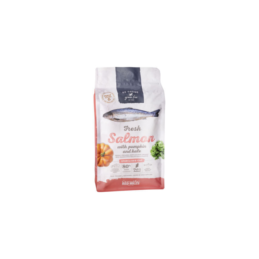 Go Native kassi täissööt lõhe, kõrvitsa ja lehtkapsaga. Täissööt stereliseeritud kassidele alates 9 kuud. Iirimaal värskest ja kohalikust toorainest toodetud kuivtoit. Kõik koostisosad on hoolikalt välja valitud ja testitud kohalikus laboris. Sisaldab D3-vitamiini ja kaltsiumi luude ja liigeste toetamiseks, tsellulooskiudusid karvapallide ennetamiseks, kibuvitsa ja magneesiumi, mis toetavad kuseteede tööd ja aitavad hoida pH taset madalamana.