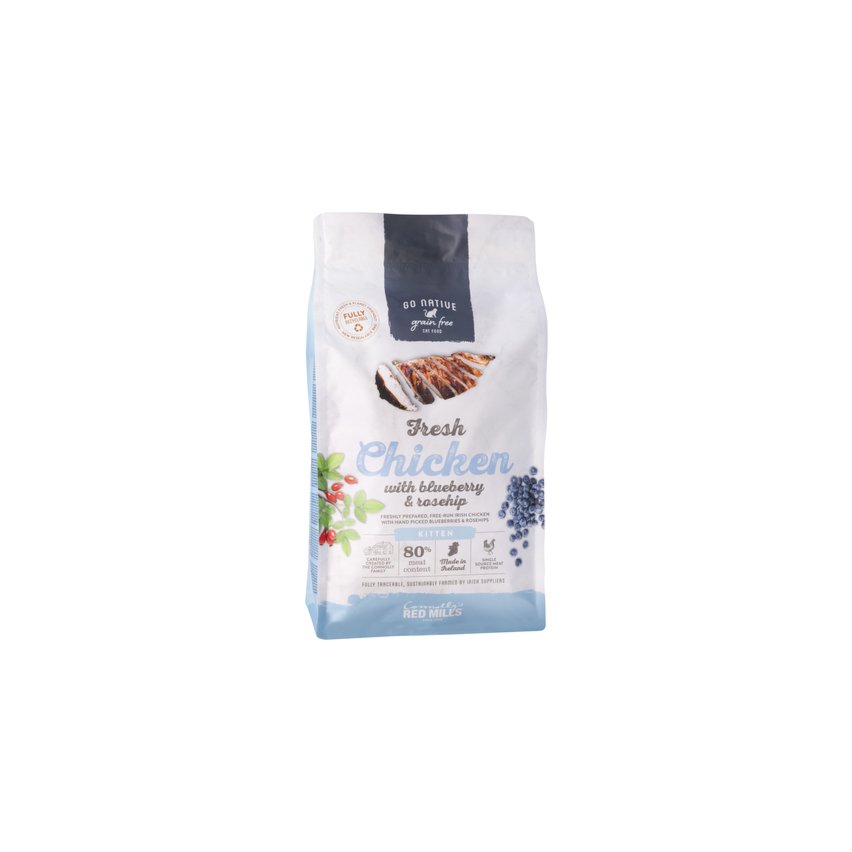 Go Native kassipoja täissööt kana, mustika ja kibuvitsaga. Täissööt kassipoegadele alates 6-8 nädalat. Iirimaal, värskest ja kohalikust toorainest toodetud kuivtoit. Kõik koostisosad on hoolikalt välja valitud ja testitud kohalikus laboris. Sisaldab immuunsust toetavad mustikad, kibuvits, mis aitab madaldada põletikke, D3-vitamiini ja kaltsiumi, luude ja liigeste toetamiseks, tauriini ajutöö toetamiseks.
