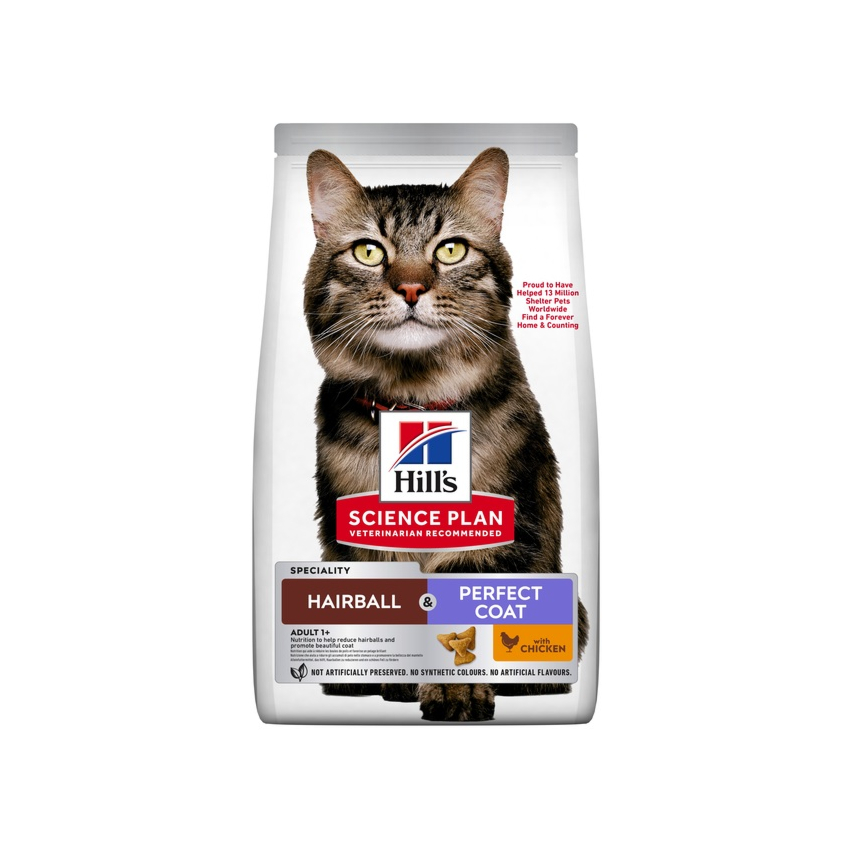 Hill's Science Plan HAIRBALL & PERFECT COAT ADULT KASSI TÄISSÖÖT KANAGA on täisväärtuslik lemmikloomasööt täiskasvanud kassidele alates 1. eluaastast.