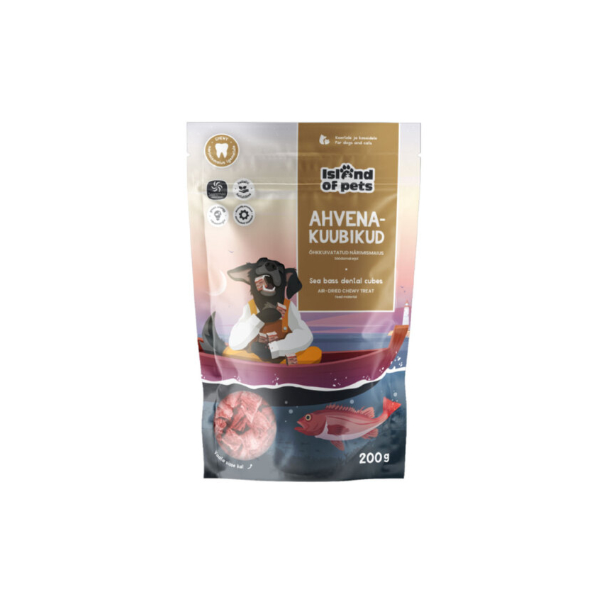 Täiendsööt - õhkkuivatatud meriahvena nahast kuubikud. Sobivad koertele ja kassidele tõhusaks hammaste puhastamiseks ning mõnusaks ajaviiteks. Närimine leevendab hammaste ja igemete sügelust ning stimuleerib ajutegevust. Kalas sisalduv D-vitamiin aitab organismil omistada nii kaltsiumi kui fosforit, mis tugevdavad ja hoiavad tervena hambaid ja luid. Vitamiin D aitab kaasa immuunsüsteemi normaalsele talitlusele. Ahvenanahk on madala kalorsusega ja kergesti seeditav ning sobib seega ka dieedil olevale lemmikule. On ohutu allergikutele.