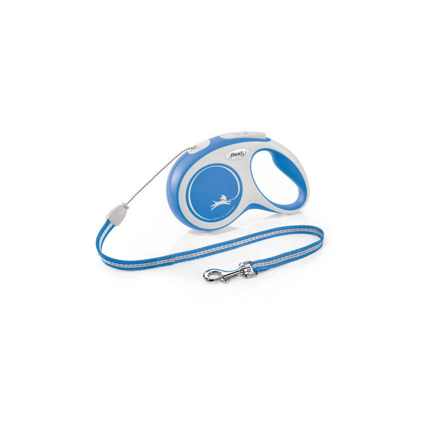 flexi New Comfort automaatne jalutusrihm suurus: S , Köis 8 m, koertele suuruses kuni 12 kg, sinine. Lisa oma flexi New Comfort automaatrihmale LED valgustus süsteem või Multi Box maiuste või kakakottide kandmiseks.