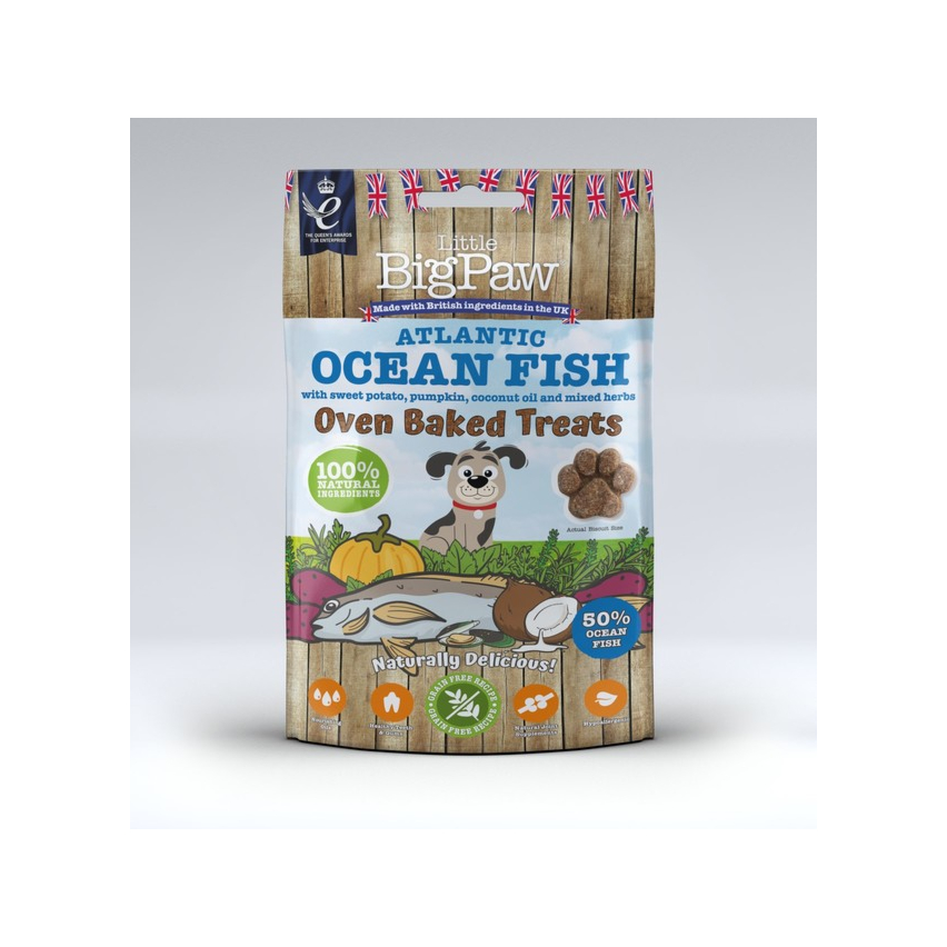 Little Bigpaw koera maius Oven Baked ookeanikalaga. 100% naturaalne, teraviljavaba ja hüpoallergeenne. Meie krõbedatel maiustel on suurepärane hammaste hooldusfunktsioon ja need aitavad kontrollida hambakivi, samuti aitavad need puhastada teie koera hambaid. 50% Atlandi ookeanikala, mis on kergesti seeditav valguallikas. Ookeanikala on äärmiselt madala kalori- ja rasvasisaldusega. Samuti on see täis Omega 3, mis tagab terve ja läikiva karvkatte. Superfoodi köögiviljad - Kõrvits on fantastiline kiudainete allikas, mis mitte ainult ei aita kaasa seedimise tervisele, vaid on täis olulisi rasvhappeid, aidates teie lemmikloomal end kauem täisväärtuslikuna tunda. Naturaalsed süsivesikud - Bataat on madala rasvasisaldusega, kuid kõrge toitainesisaldusega, mistõttu on see kergesti seeditav. Ja kikerherned - täis valku ja kiudaineid, mis aitavad kaasa seedetrakti tervisele. Naturaalselt toitvad ravimtaimed, sealhulgas yucca ekstrakt, mis parandab suurepäraselt naha ja karvkatte seisundit.