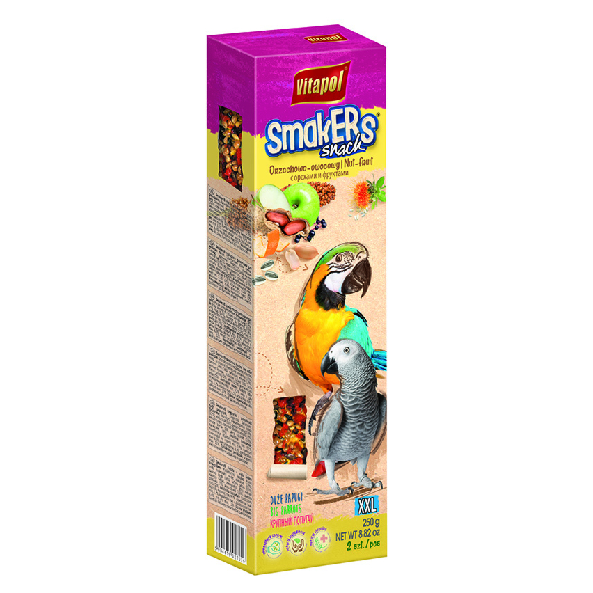 Smakers - maius teie viirpapagoile. Viljapeakujuline maius on kaetud erinevate seemnete, terade ja maasikatega. Selline maius ei ole mitte ainult maitsev, vaid ka kasulik. Toode sisaldab rikkalikult vitamiine, mineraale ja mikroelemente, mis aitavad linnu tervist tugevdada ja parandada sulgede värvust. Kõvad viljapead teritavad hästi nokka ning see ennetab noka deformeerumist. Maius on väga toitev ning seda saab kasutada kui lisandit põhitoidu kõrvale. Lisaks sellele, sisaldab see palju vitamiine. Toode ei sisalda säilitusaineid, on ainult naturaalne värvaine, mis on loomadele ohutu. Artikkel: 50048
