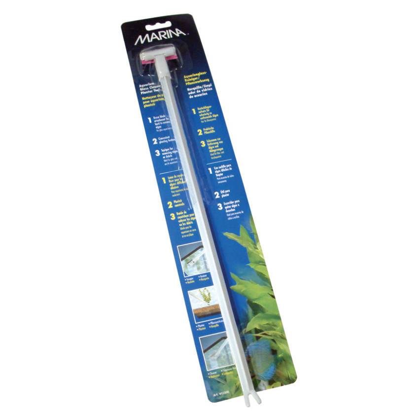 Marina Aquarium Glass Cleaner on praktiline, mitmeotstarbeline tööriist akvaariumide hooldamiseks. teraotsik kangekaelsete vetikaplekkide eemaldamiseks (ainult klaasakvaariumide puhul); švamm määrdunud klaas- või akrüülpindade puhastamiseks; ja selle otsas on taimede hooldamiseks praktiline taimekahvel.