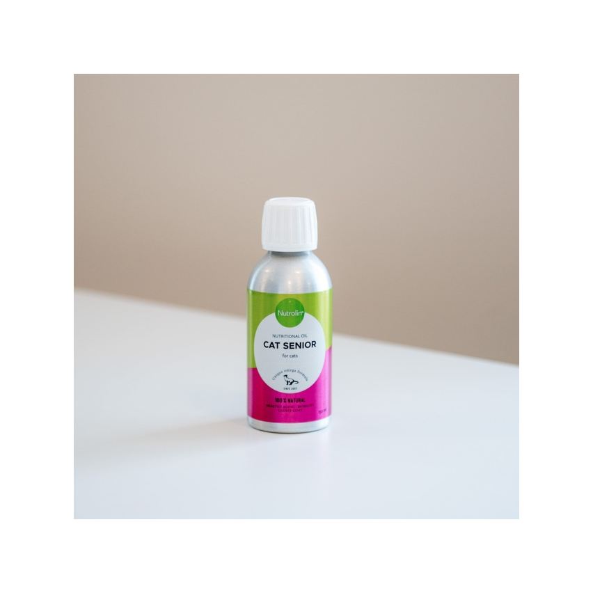 Nutrolin Senior õli vanemas eas kassidele on täiendsööt rikastatud rasvhapete ja antioksüdantidega tervise toetamiseks. Parandab eaka kassi liikuvust, toetab aju ja südame tööd, toidab ja kaitseb nahka ning parandab karvkatte kvaliteeti. Sisaldab rohkesti omega-3 rasvhappeid (200 mg/ml), mis toetavad liigeseid ja elutähtsaid organeid. Omega-3 rasvhapped võivad parandada ka eakate kasside kognitiivset võimekust.
