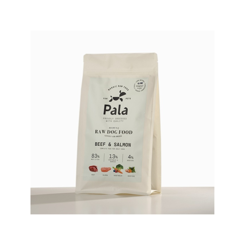 Koostis: Veiseliha (50%), lõhe (33%), porgand, peet, seller, brokoli, pruunvetikas, purustatud munakoored, kurkum, mustikad, jõhvikad, petersell, lõheõli, nisuoras, must küüslauk, õllepärm, must pipar. Ei sisalda lisaaineid, sünteetilisi lisandeid, maitse- ega säilitusaineid.