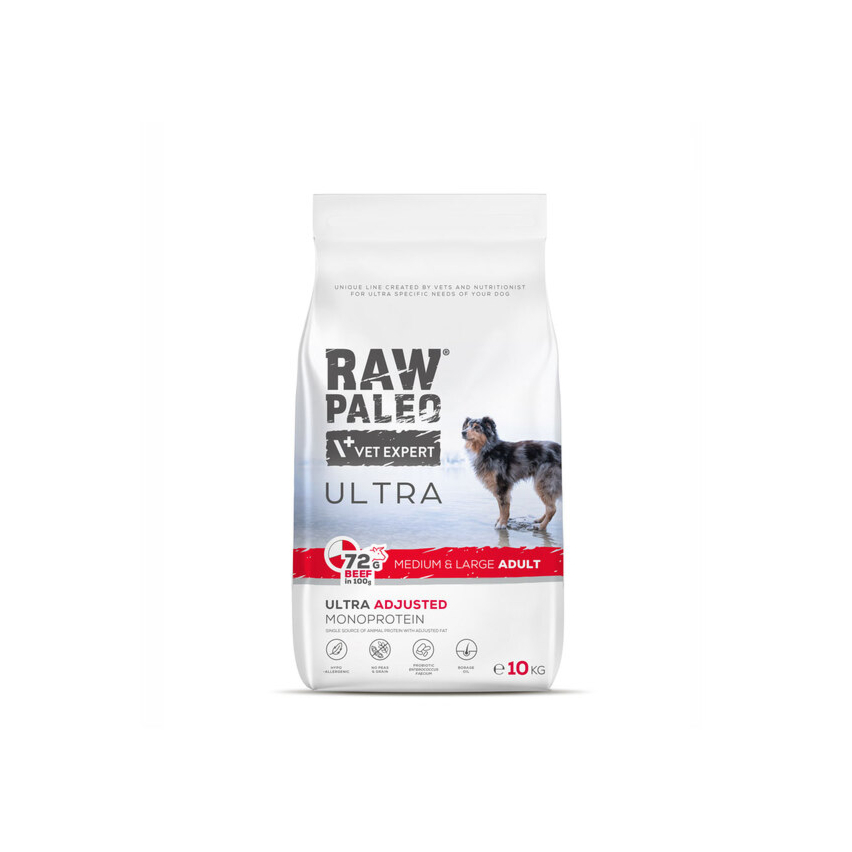 Raw Paleo Ultra täissööt veiselihaga keskmist ja suurt tõugu täiskasvanud koertele (üle 1 aasta vana, üle 8 kg kehamassi). See retsept on monoproteiine, ehk sisaldab ainult üht loomset valguallikat (veiseliha) ja rasvaallikat (veiseliha rasv). Retsept on herne- ja teraviljavaba. Retseptis on kasutatud kurgirohu õli, mis aitab toetada naha ja karvkatte seisukorda. Rikastatud probiootilise Enterococcus faecium’iga, mis toetab tervislikku mikrobiooti, tagades õige seedimise ja toitainete omastamise.