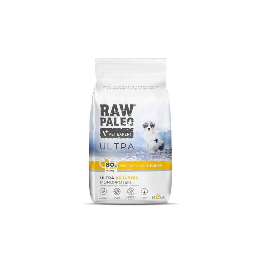 Raw Paleo Ultra täissööt kalkuniga keskmisele ja suurt tõugu kutsikale (kuni 12 kuu vanuseni, üle 8 kg kehamassi). See retsept on monoproteiiniline, sisaldades ainult üht loomset valguallikat (kalkun) ja rasvaallikat (kalkuni rasv). Retsept on herne- ja teraviljavaba. Retseptis on kasutatud kurgirohu õli, mis aitab toetada naha ja karvkatte seisukorda. Rikastatud probiootilise Enterococcus faecium’iga, mis toetab tervislikku mikrobiootat, tagades õige seedimise ja toitainete omastamise.