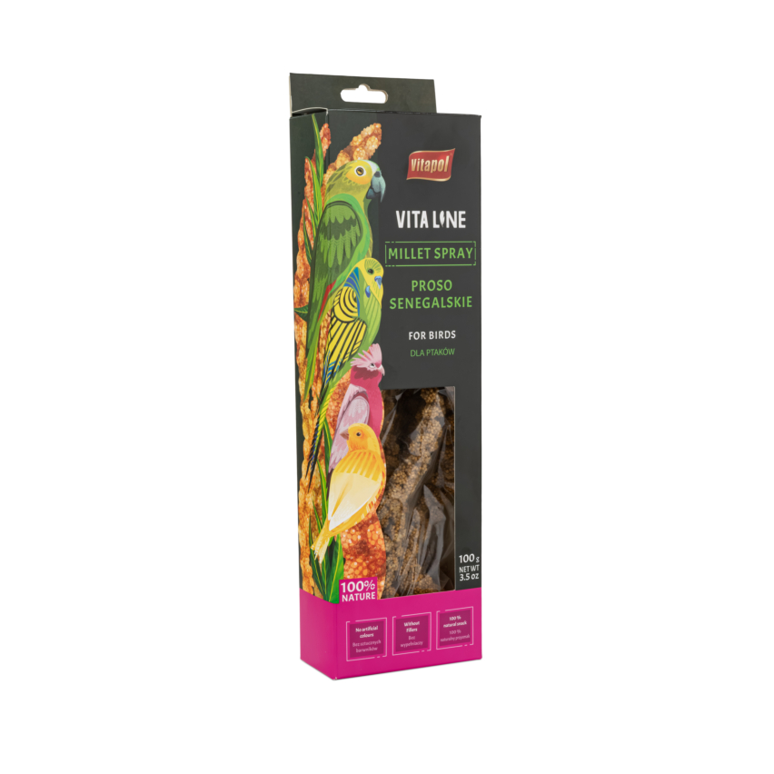 Vitapol, hirsi viljapead, 100g. Täiendsööt lindudele. Kasutamisjuhis: viljapea kinnitatakse puuri sees lemmikule kättesaadavas kohas. Koostis: senegali hirsi viljapead. Sisaldab: valke 10,8%, rasvu 4,4%, kiudaineid 8,3%, tuhka 2,9%. Hoida kuivas jahedas kohas.