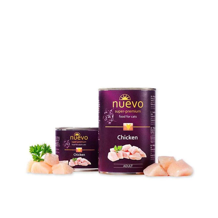 Nuevo Chicken'i eripära on kõrge lihasisaldus (71 %), mis sisaldab palju väärtuslikke valke. See vastab tundliku kassi individuaalsetele vajadustele, ainult värske liha koos oluliste vitamiinide ja mineraalainetega. nuevo Chicken on hea energiaallikas, hästi seeditav ja eriti maitsev.