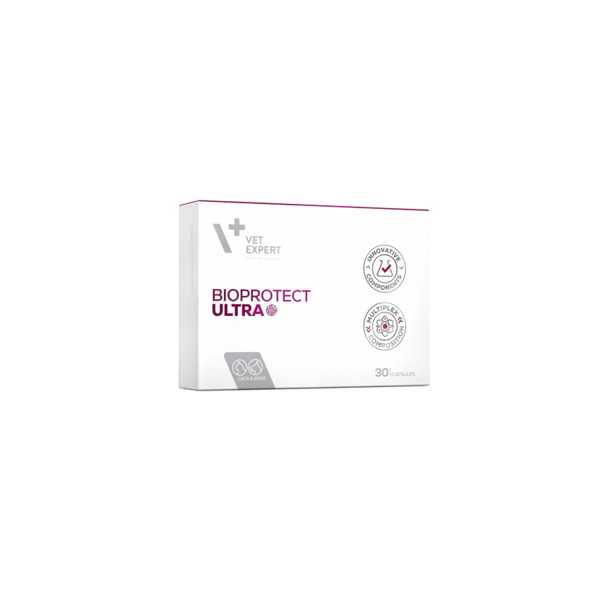 BioProtect Ultra on uuenduslik täiendsööt, millel on lai toimespekter optimaalse mikrobioomi toetamisel ja seedetrakti tervise kaitsmisel. Eriti soovitatav seedetrakti düsbioosiga koertele ja kassidele. Preparaat ühendab endas nii pro-, pre- kui ka postbiootikumide omadused, tagades nende sünergilise toime soolestikus. Koostises sisalduvad probiootilised bakteritüved: Enterococcus faecium ja Lactobacillus acidophilus, lisatud prebiootilised galakto-oligosahhariidid ning postbiootiline mikrokapseldatud naatriumbutüraat ja Limosilactobacillus reuteri võimaldavad kompenseerida düsbioosi, toetades samal ajal enterotsüütide taastumist. Soolteseina kaitsebarjääri ja seedimise toetamiseks on Bioprotect Ultras Yarrowia lypolitica pärm, mis on paljude bioloogiliselt aktiivsete ainete (sealhulgas valkude, EFA-de, vitamiinide, beeta-glükaan ja lipaas-2) allikas. Koostise rikastamine L-trüptofaaniga, mis on serotoniini prekursor, aitab toetada sidet soolestiku-aju telje vahel, reguleerides samal ajal seedetrakti toimimist.