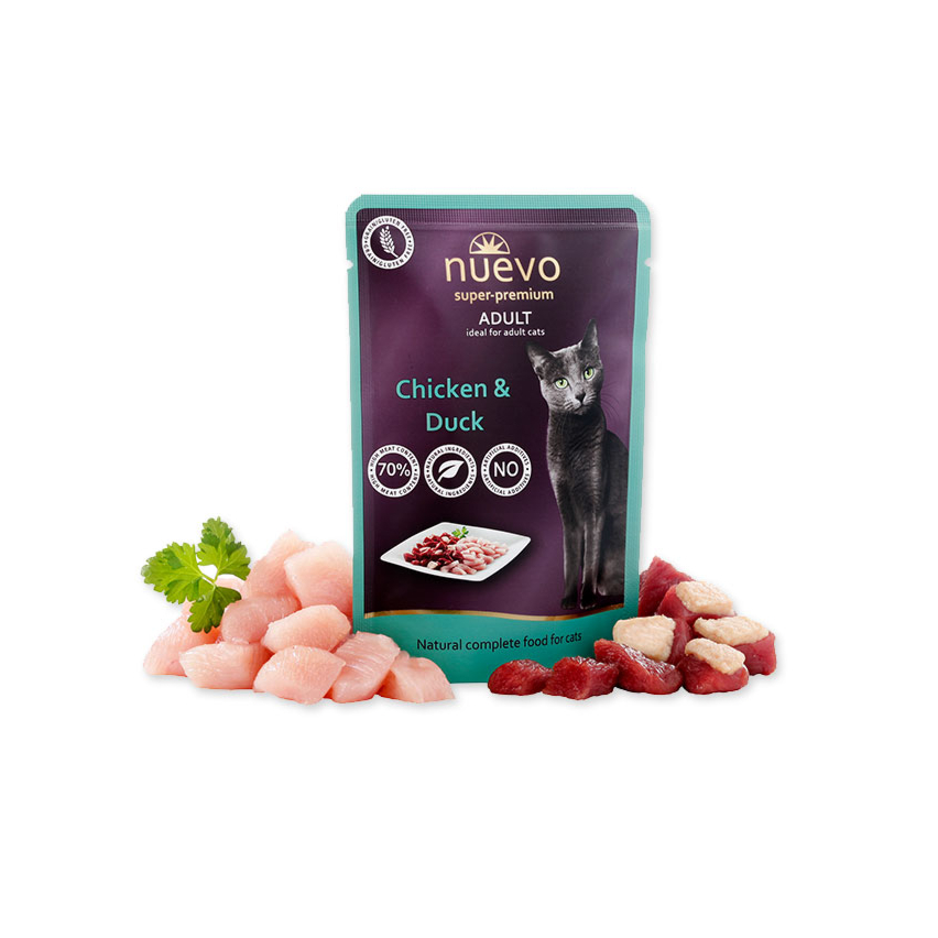 NUEVO Chicken & Duck contains 72 % fresh chicken and duck meat combined with high quality salmon oil for optimal level of omega 3 & omega 6 fatty acids. Highest palatability because of its fresh ingredients will satisfy even the choosy cat!