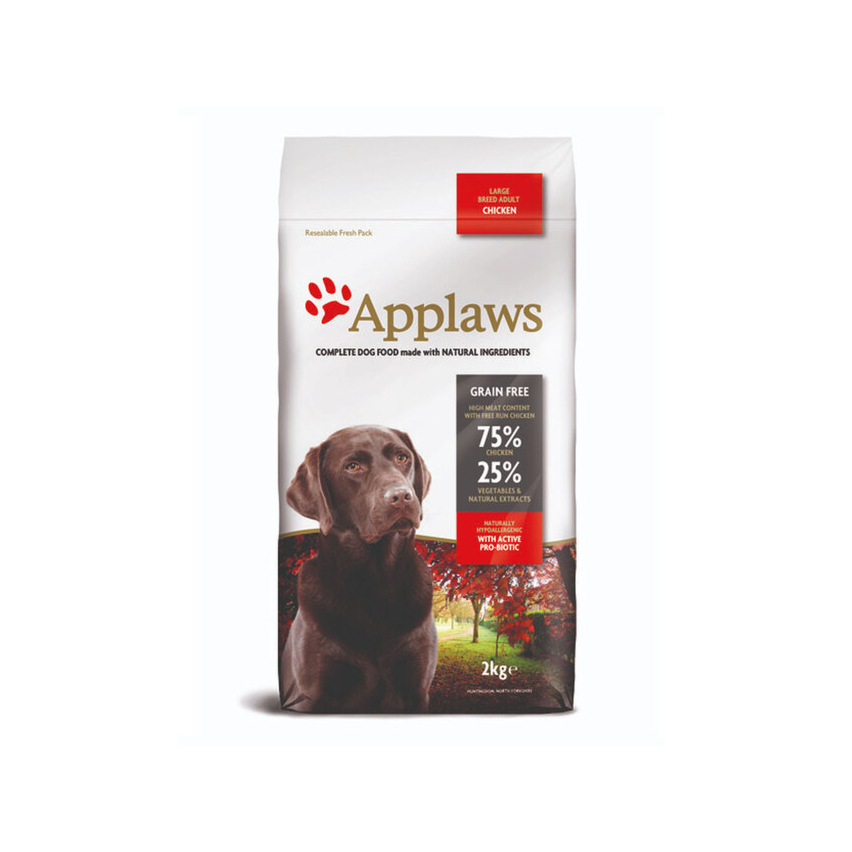 Applaws kuivtoit kanaga suurt tõugu täiskasvanud koertele. Sisaldab 75% kanaliha, juurvilju, naturaalseid ekstrakte ja probiootikume. Ei ole lisatud teravilja. Hüpoallergeenne. Applaws kuivtoit on täistoit. Kuna see on kõrge toiteväärtusega toit, siis see tähendab seda, et söödetavad kogused on väiksemad kui tavalise koeratoidu puhul.
