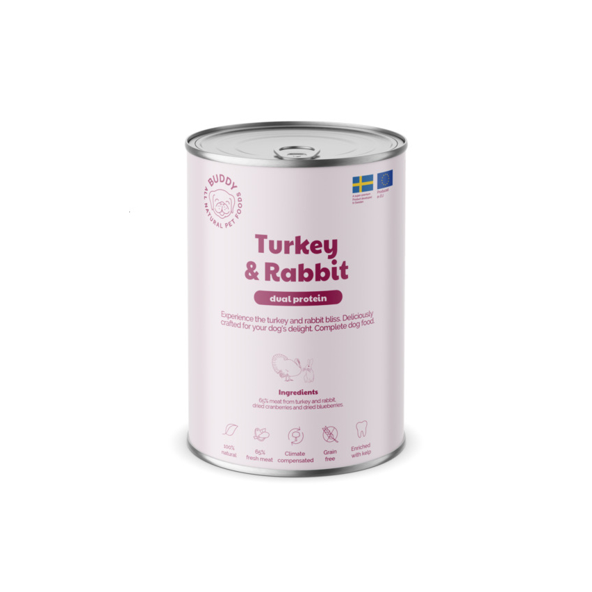 Buddy märgtoit koertele kalkuni ja küülikuga. Täissööt täiskasvanud koertele. Ideaalne koertele, kes võtavad kergesti kaalus juurde. Sisaldab supertoite nagu pruunvetikas ja jõhvikas, mis tugevdavad immuunsüsteemi ja soodustavad seedimist. Koostis: 65% liha ja loomsed saadused (26% küülikuliha, 14% kalkuniliha, 13% kalkunisüda, 12% kalkunipugu), 2% hernejahu, 0,7% lignotselluloos, 0,3% kaltsiumkarbonaat, kuivatatud pruunvetikas (0,1%), kuivatatud jõhvikad (0,01%), kuivatatud mustikad (0,01%). Analüütilised koostisosad: toorvalk 8,0%, toorrasv 5,5%, toortuhk 2,1%, toorkiud 0,8%, niiskus 78,0%, kaltsium 0,15%, fosfor 0,1%, naatrium 0,2%, oomega-3-rasvhapped 0,1%, oomega-6-rasvhapped 1,0%. Toitainelised lisandid (1 kg kohta): D3-vitamiin (3a671) 250 RÜ, E-vitamiin (3a700) 125 mg, B1-vitamiin (3a821) 2,6 mg, biotiin (3a880) 0,4 mg, tsink (3b612) 20 mg, raud (3b107) 8 mg, mangaan (3b505) 2,4 mg, kaaliumjodiid (3b201) 0,5 mg. Metaboliseeruv energia: 980 kcal/kg. Söötmisjuhend: Serveerige toitu toatemperatuuril. Soovituslik päevane kogus on näidatud söötmistabelis. Toitumisalane vajadus võib varieeruda sõltuvalt koera aktiivsusest ja keskkonnast. Hoidke alati kaasas kauss värske joogiveega. Kõlblikkusaeg ja partii number on märgitud purgi põhjale. Pärast purgi avamist hoidke külmkapis ja tarvitage 3 päeva jooksul.