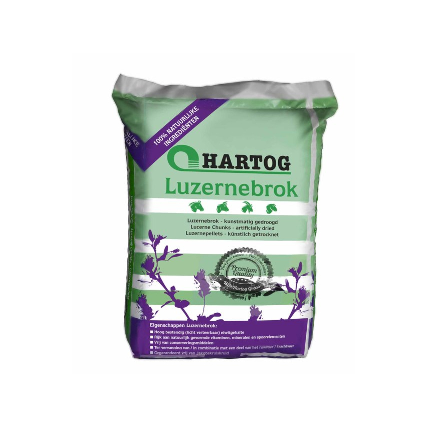 Hartog Luzernebrok on tehtud värskelt lõigatud ja kunstlikult kuivatatud lutsernist, mis on pressitud 6mm tekstuuriga graanuliteks.