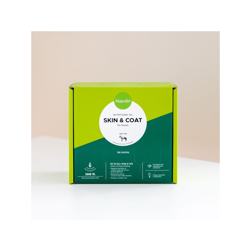 Nutrolin Skin & Coat täiendsööt hobustele 3000ml. Naha ja heaolu kaitseks loodud õli leevendab sügelust ja ketendust, toetab suvise nahalööbe ja vihmapõletiku ravi, vähendab korduvate nahapõletike riski ning annab karvale kauni läike. Unikaalne, patenteeritud koostis. Võib sisaldada vähesel määral CBD-d.
