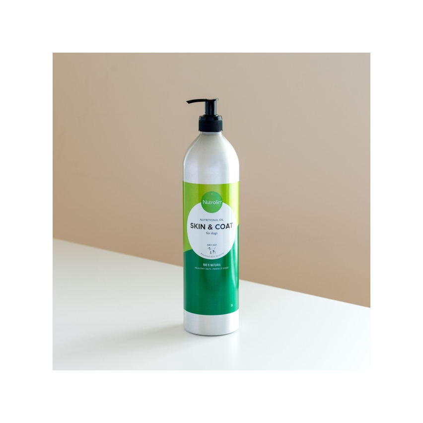 Nutrolin Skin & Coat õli on täiendsööt koertele 1000ml. Nutrolin Skin & Coat õli toidab ja kaitseb koera karvastikku. Patenteeritud rasvhapete ja antioksüdantide valem toimib tõhusalt kõikidel karvatüüpidel. Õli sisaldab rohkelt asendamatuid rasvhappeid ning GLA ja SDA-d, et toetada naha loomulikku kaitsevõimet. Parandab naha niiskustasakaalu, aidates võidelda allergeenide ja muude ärritajatega. Toetab naha, küünte ja käppade uuenemist ning tervist.