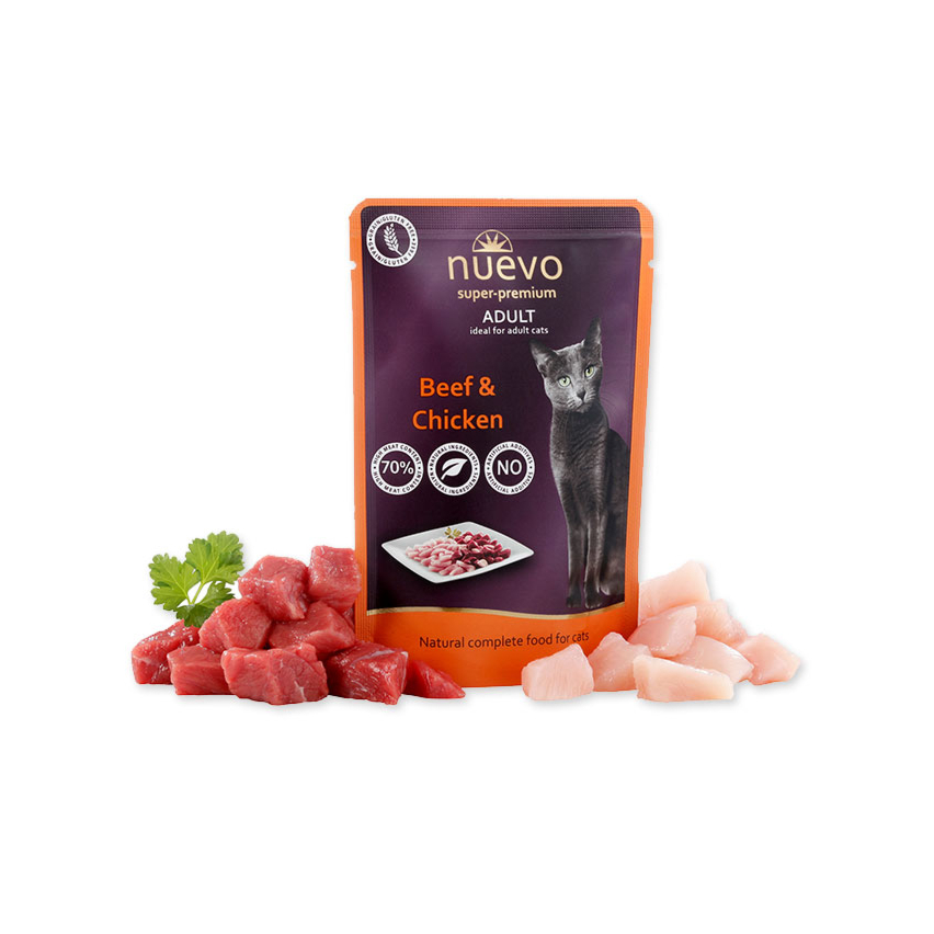 Полнорационный корм для кошек NUEVO Adult с говядиной и курицей.